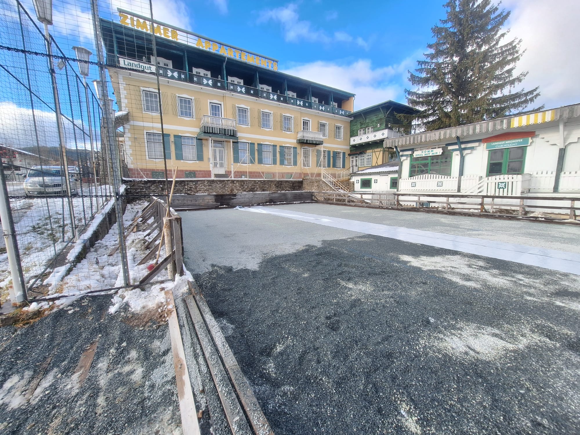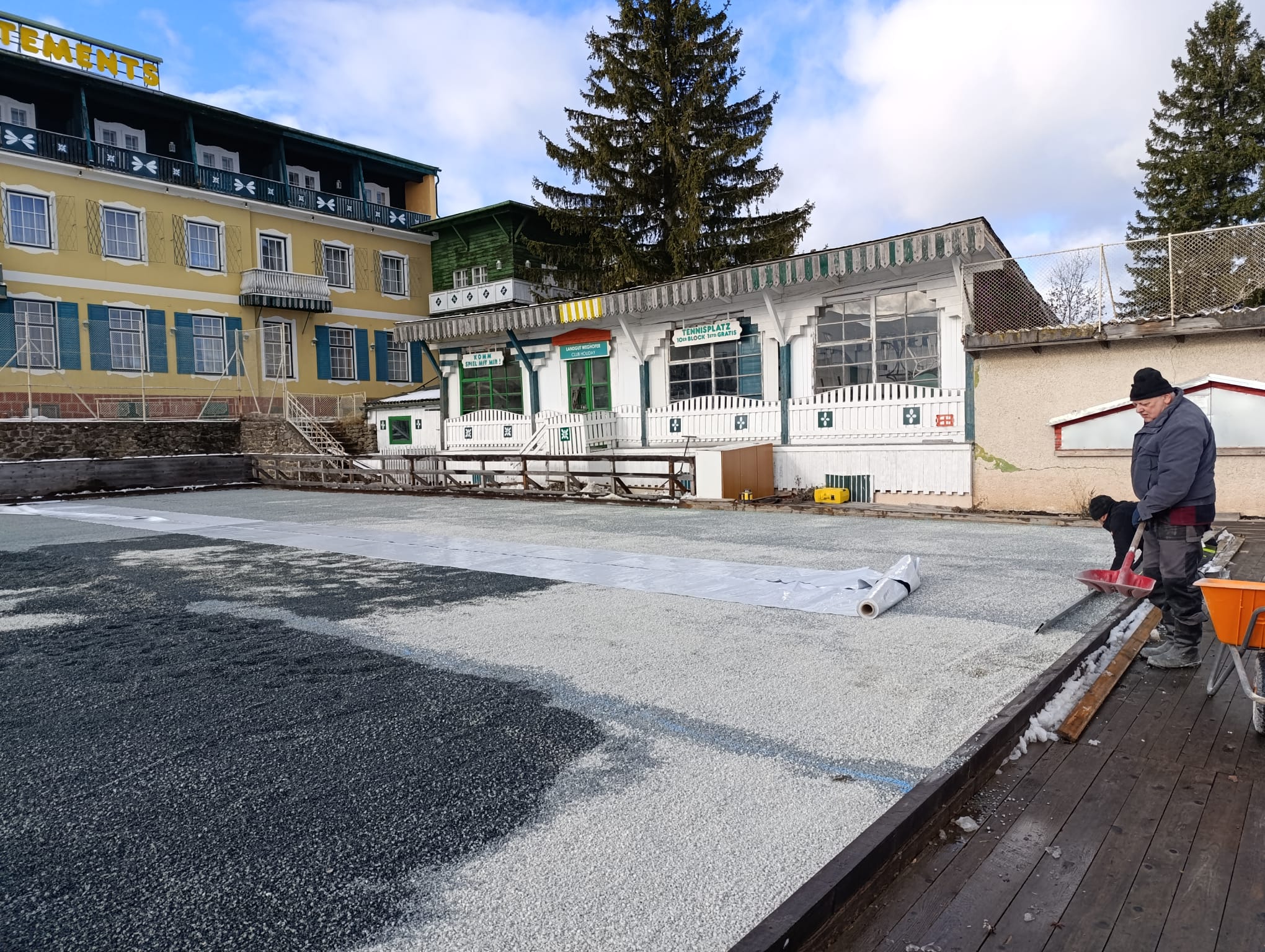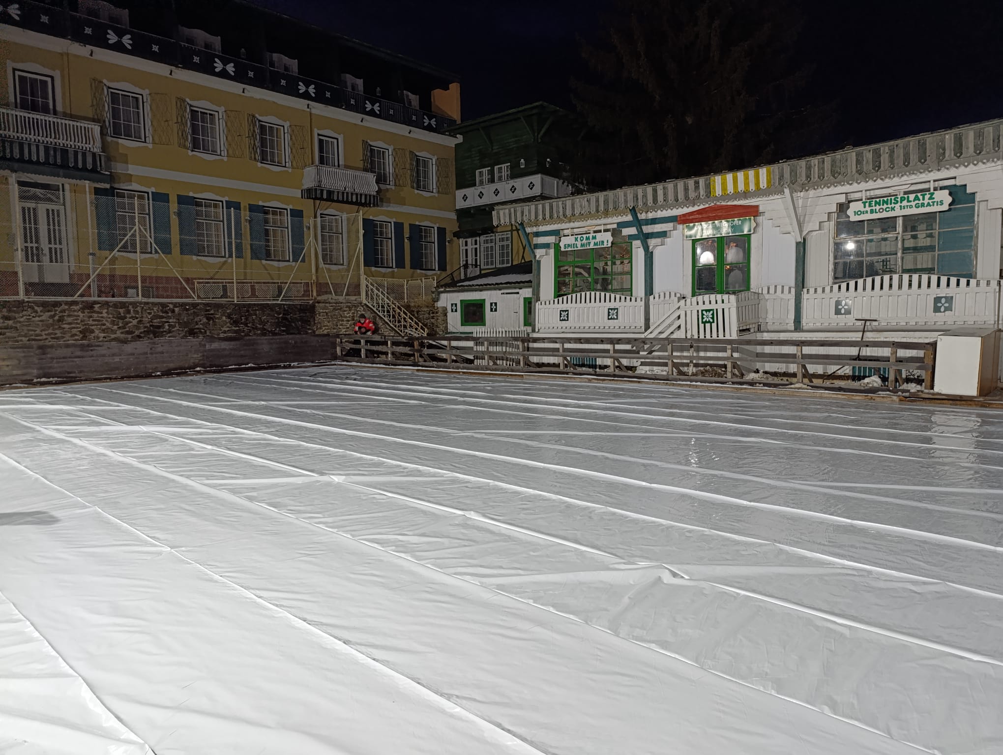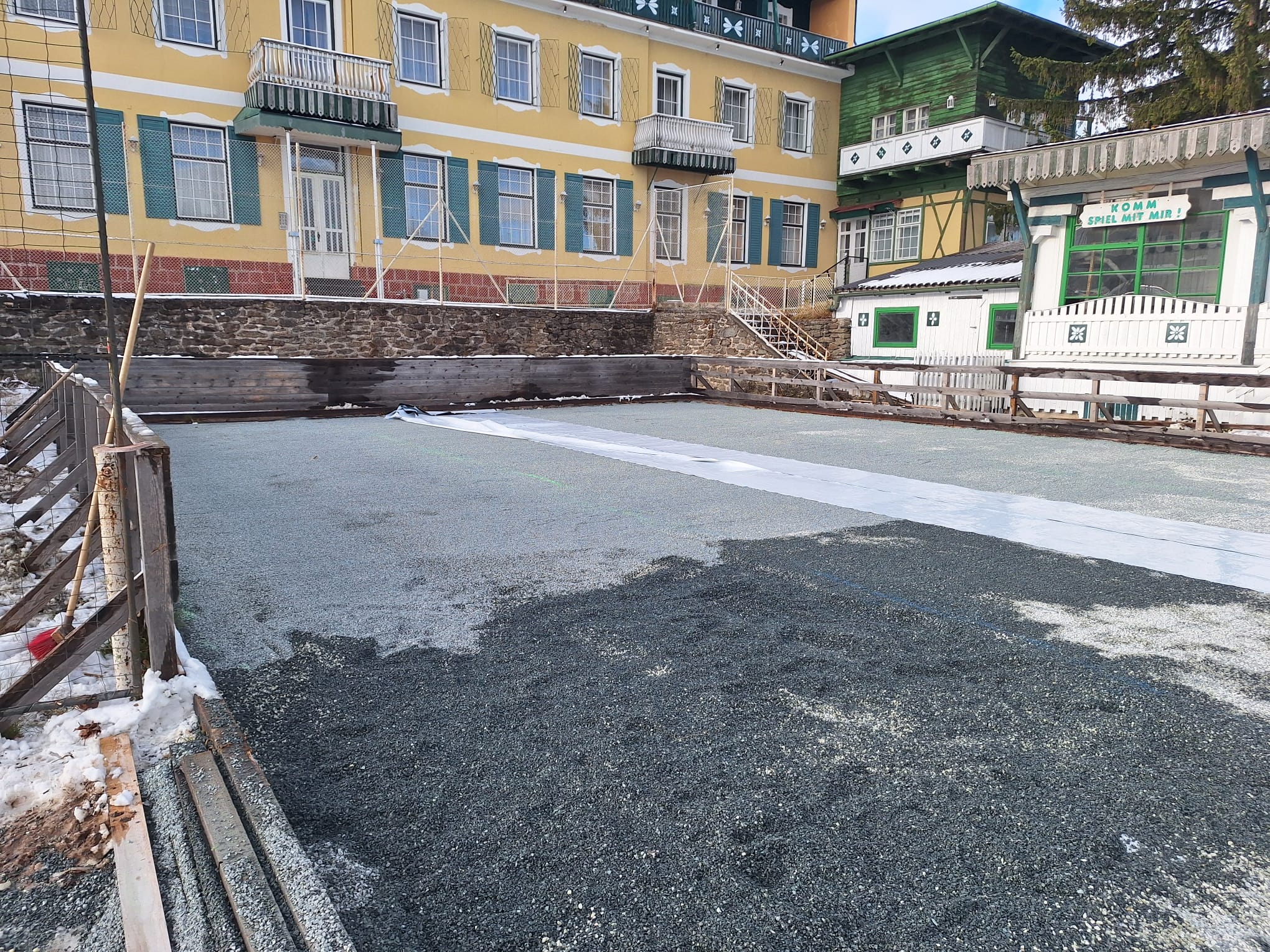 Nachdem ein großer Teil der Beteiligten des 1. Dorfgespräches 2022 dem Wunsch nach einem Eislaufplatz sehr hohe Priorität eingeräumt haben, wurden im Oktober wurden vom DEV-Vorstand die Mittel zur Errichtung bewilligt. Nach Verhandlungen mit dem Besitzer des alten Tennisplatzes vom Hotel Landgut, Hrn. Weghofer konnte auf dem Platz der Eislaufplatz errichtet werden.